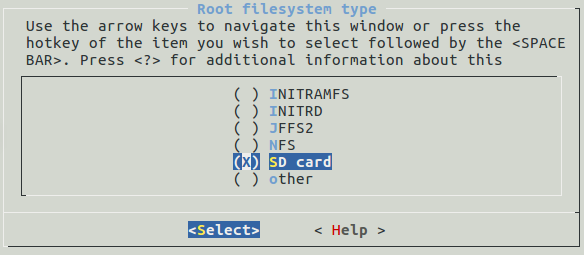 - Use the PetaLinux configuration tool to set the root filesystem to SD card (default is INITRAMFS).